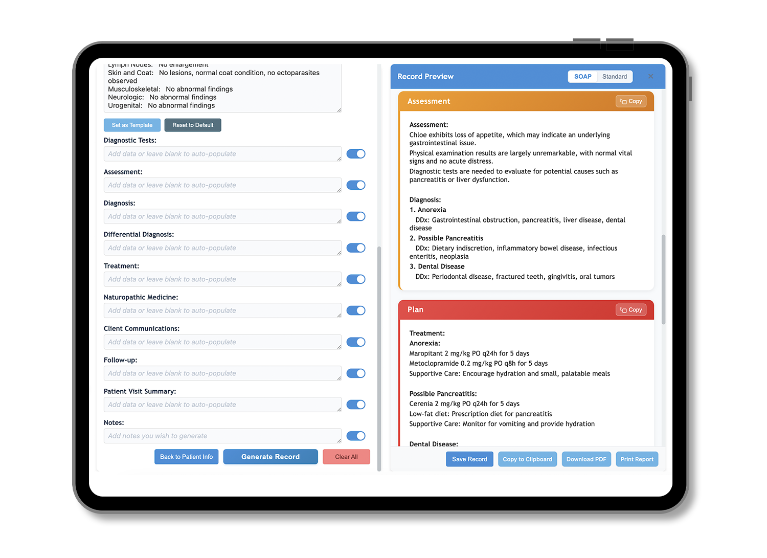 PetSOAP instantly creates a fully formatted SOAP note, complete with assessment and plan.